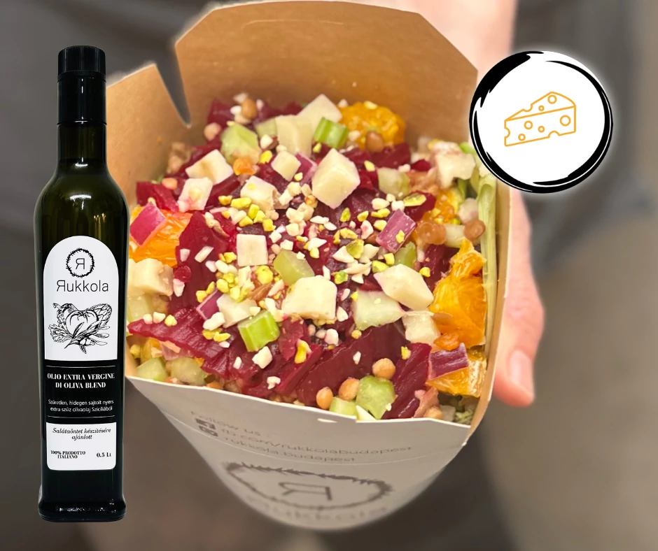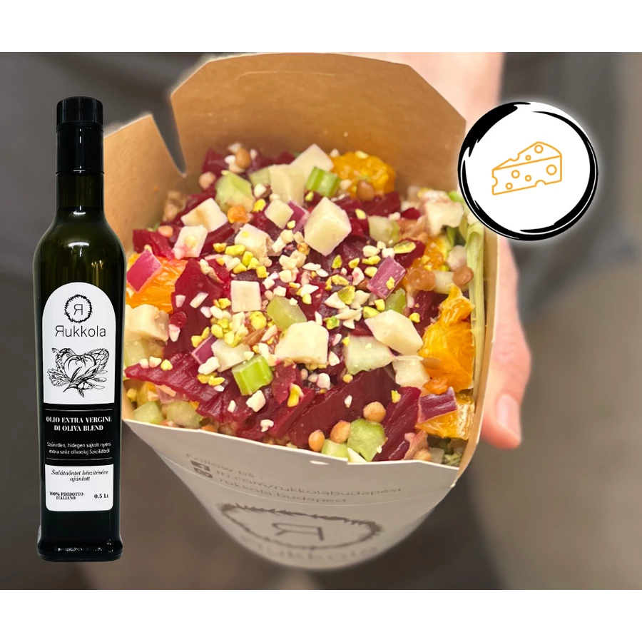 Káposzta- és saláta félék vegyesen, gabona, lencse, narancs, lilahagyma, főtt cékla, pisztácia, pecorino, csilis olíva olaj,