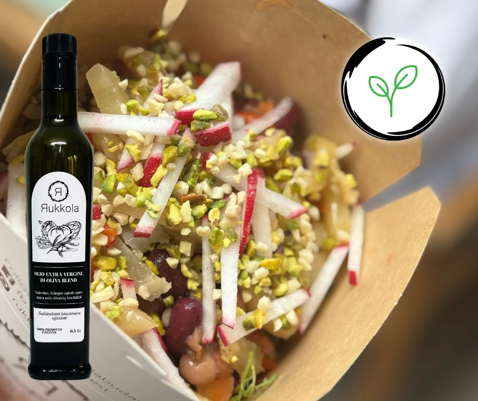 - Az egészséges összetevők mint saláta és káposztakeverék gabonával, a paradicsom, kaliforniai paprika és vörösbab ötvöződnek a csilis olíva olaj és marinált padlizsán borecetes aromájával, amelyek segítenek a mindennapi megszokott étel helyett egy különlegesebb mediterrán ízélményben adni, mindezt úgy, hogy meghintjük tört pisztáciával.